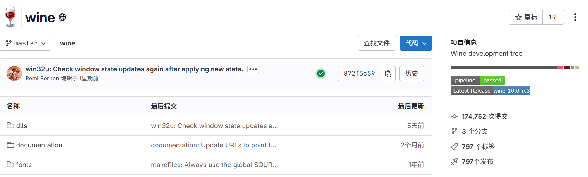 这时,开源社区的力量开始闪耀! 首先登场的是Wine(https://gitlab.winehq.org/wine/wine)项目。 自1993年启动,历经31年,17万多次提交,Wine的目标是:用Linux的系统接口,重新实现Windows的所有DLL代码!
