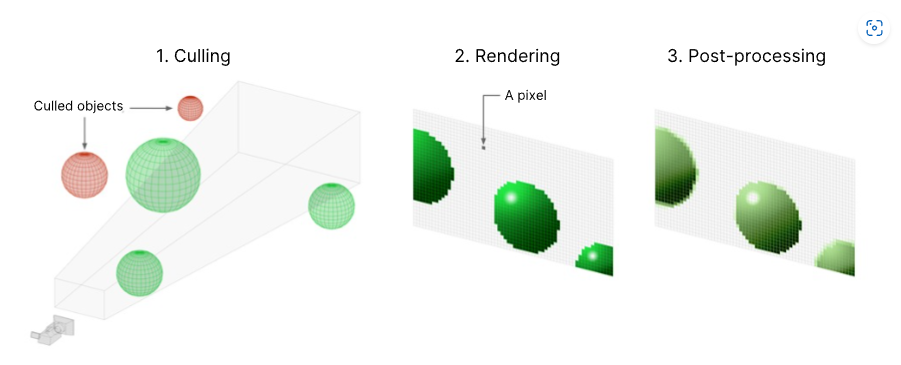 - Culling, where the pipeline decides which objects from the scene to display. This usually means it removes objects that are outside the camera view (frustum culling) or hidden behind other objects (occlusion culling ).