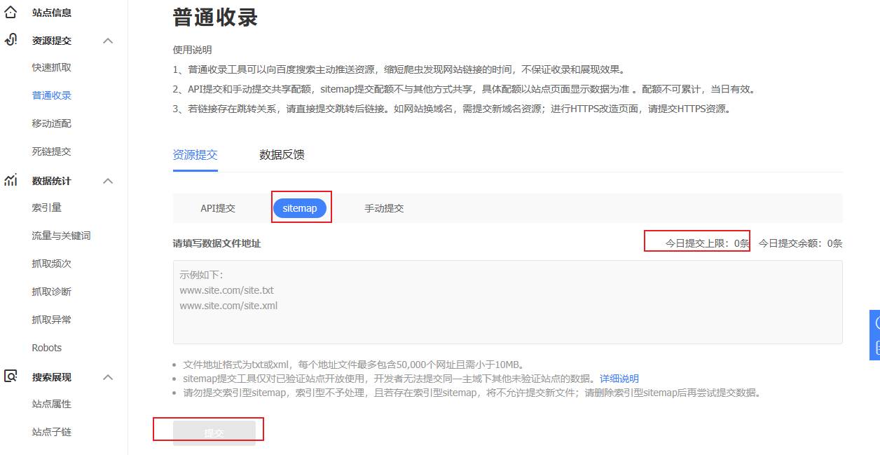 普通收录的sitemap方式提交没有次数,不知道是不是要交钱