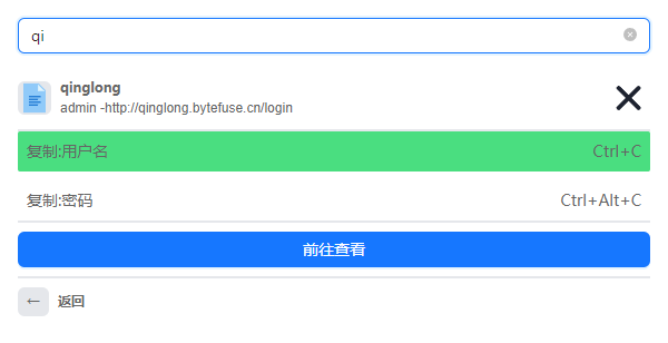 存好密码后,如何快捷的使用呢,在激活快捷窗口后,输入关键字,找到相关密码信息,点回车即可。