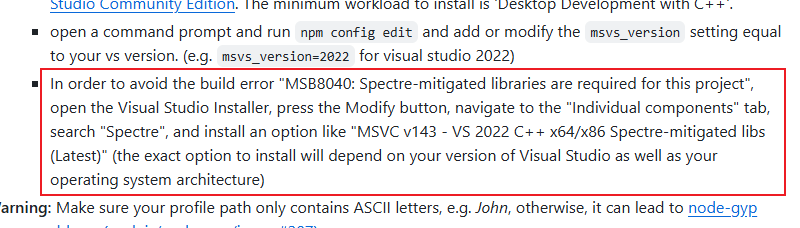 - if you install Node on your system using the Node installer from the Node.JS page then ensure that you have installed the 'Tools for Native Modules'. Everything should work out of the box then.