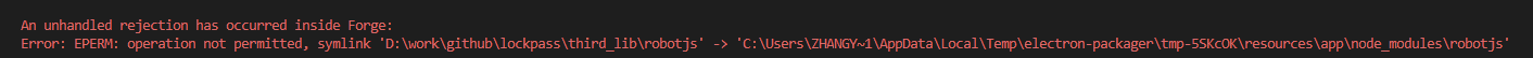 "make": "npm run typecheck&& cross-env DEBUG=electron-packager electron-forge make",5.2 错误1:EPERM: operation not permitted, symlink
