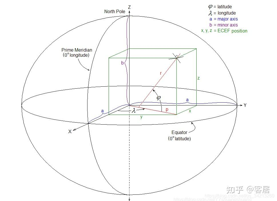 (1):大地纬度是过用户点P的基准椭球面法线与赤道面的夹角。纬度值在-90°到+90°之间。北半球为正,南半球为负。
