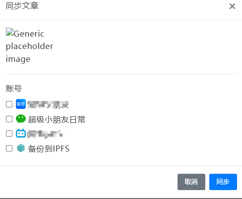 - 点同步后,弹出一个平台列表,用户选择平台列表后,点同步,系统就会将文章分发到各个平台