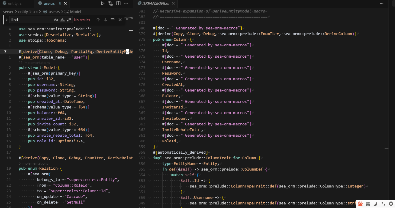 - 将你的光标放在你想要展开的宏调用上,例如 #[derive(DeriveEntityModel)] 或者 println!。